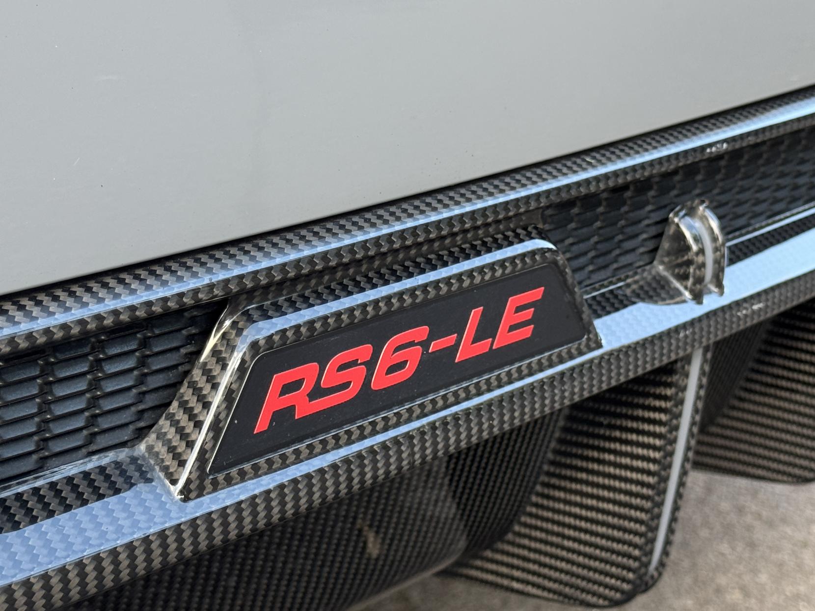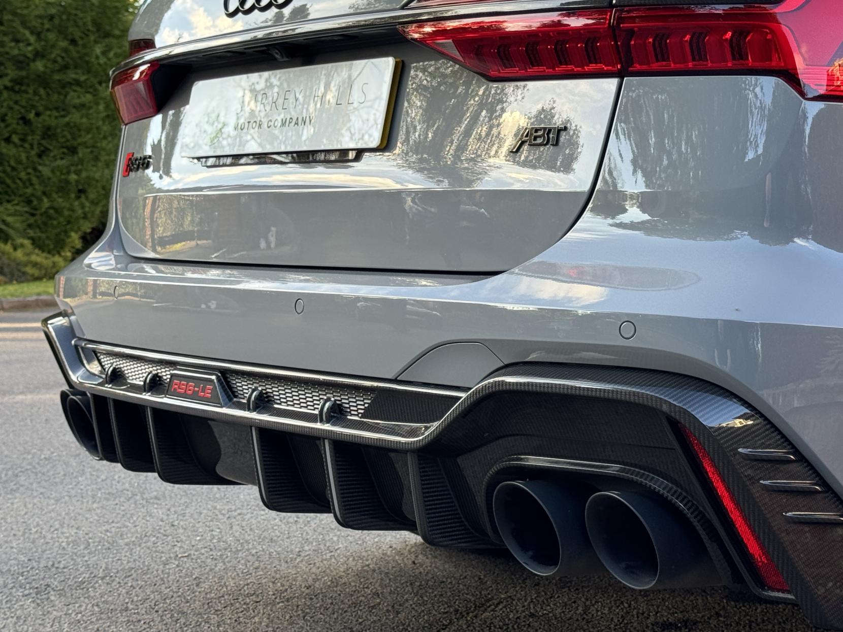 On the exterior, this RS6 stands out with its extensive use of carbon fibre. The ABT front lip, bonnet insert, side skirts, rear wing, and mirror caps are all crafted in high-gloss carbon, reducing weight while enhancing the car’s aerodynamics and aggressive stance. The ABT rear skirt insert includes the RS6-LE badge, underscoring its rarity. The ABT IR22 forged wheels, finished in glossy black, are fitted with Goodyear Eagle F1 Supersport tyres, ensuring grip and stability. The ABT stainless steel exhaust with 102-mm endpipes not only improves performance but also creates a powerful, unmistakable sound.