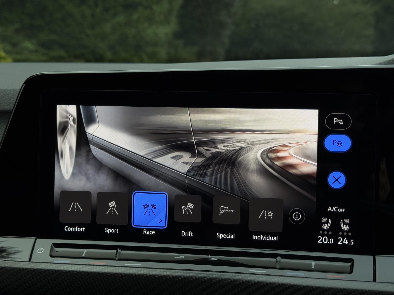 The Golf 2.0 TSI R 20 Years is equipped with a host of desirable factory-fitted options. The Akrapovic titanium sport exhaust system, a £3,600 upgrade, delivers a thrilling exhaust note while also reducing weight to enhance performance. The Discover Nav Pro system, featuring internet connectivity and streaming, ensures seamless access to navigation, music, and apps, making every journey more enjoyable. Additionally, the head-up display projects vital information such as speed and navigation guidance directly onto the windscreen, allowing you to stay focused on the road.